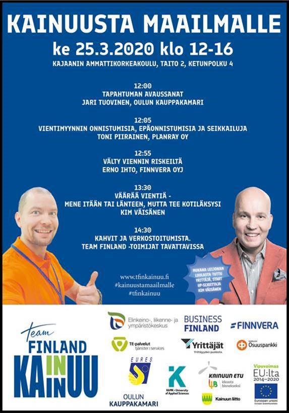 Menestyminen kansainvälisillä markkinoilla vaatii hyvää valmistautumista. Toista kertaa järjestettävä Kainuusta maailmalle -iltapäivä on verkostoitumistapahtuma kansainväliseen kasvuun tähtääville yrityksille ja yritysten ystäville.