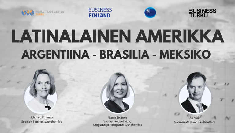 Aamupäivän tilaisuudessa aiheena Argentiinan, Brasilian ja Meksikon markkinoiden tilanne ja näkymät suurlähettiläiden kertomana. Lisäksi Business Finlandin edustajat kertovat tarkemmin kaivos-, meri- ja terveysteknologiamarkkinoista ja kuulemme myös suomalaisyrityksen omia kokemuksia Latinalaisessa Amerikassa toimimisesta.